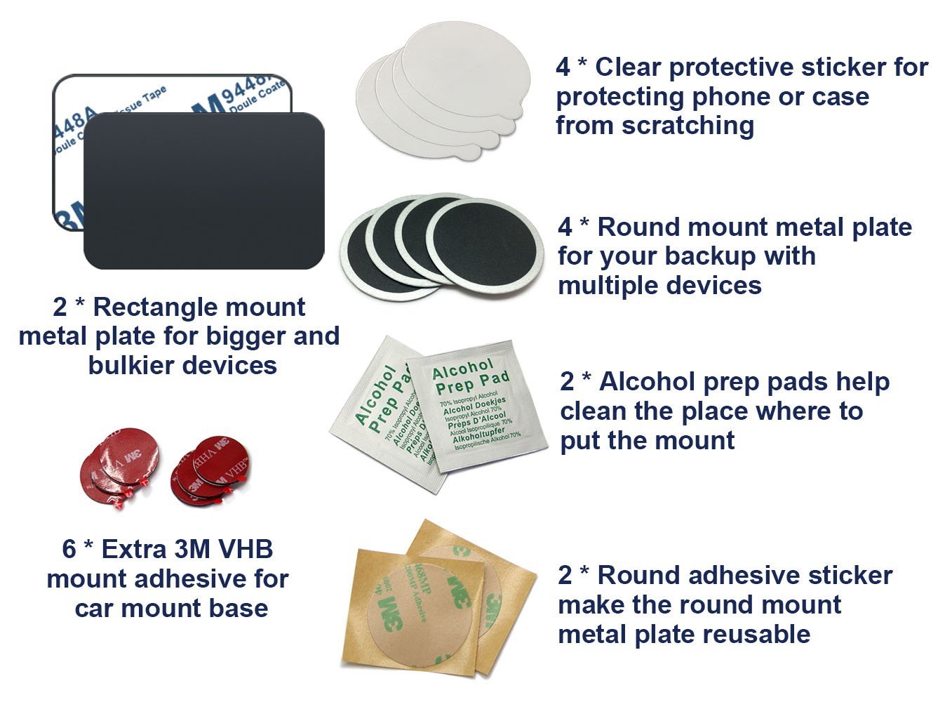 - Four larger thin metal plates are always backed up for multiple devices. The 4 round metal mounting plates have 3m of adhesive on the back. Even on bumpy roads, you can use any magnetic car mount to secure any size smartphone.